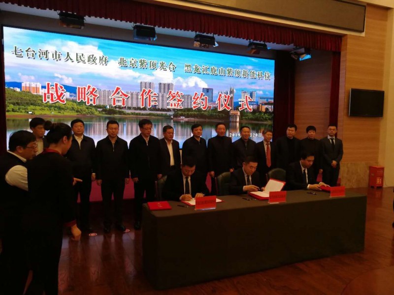 2019年1月20日上午,七臺河市人民政府、北京紫頂光合企業(yè)管理中心(有限合伙)、黑龍江鹿山紫頂新能科技有限公司簽約儀式在市專家接待中心舉行。市委書記楊廷雙,市委副書記、市長賈君,市委常委、秘書長蔣和慶,市政府副市長王義光,市政府秘書長陳志、鹿山集團鐘金海等領(lǐng)導(dǎo)出席簽約儀式。市委常委、副市長安虎賁主持簽約儀式。